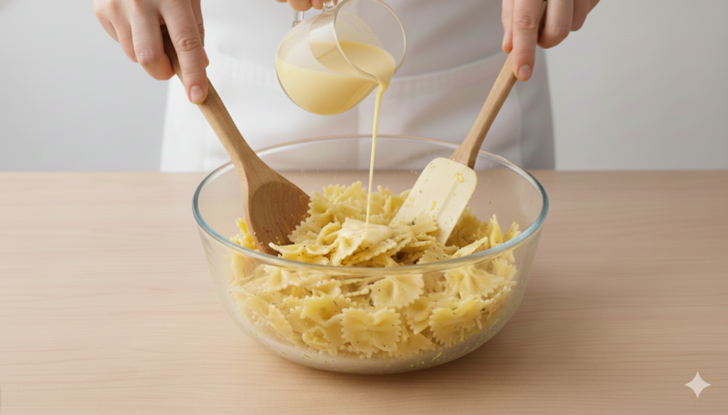 💡 Avoid overcrowding your pan while mixing the pasta with dressings.